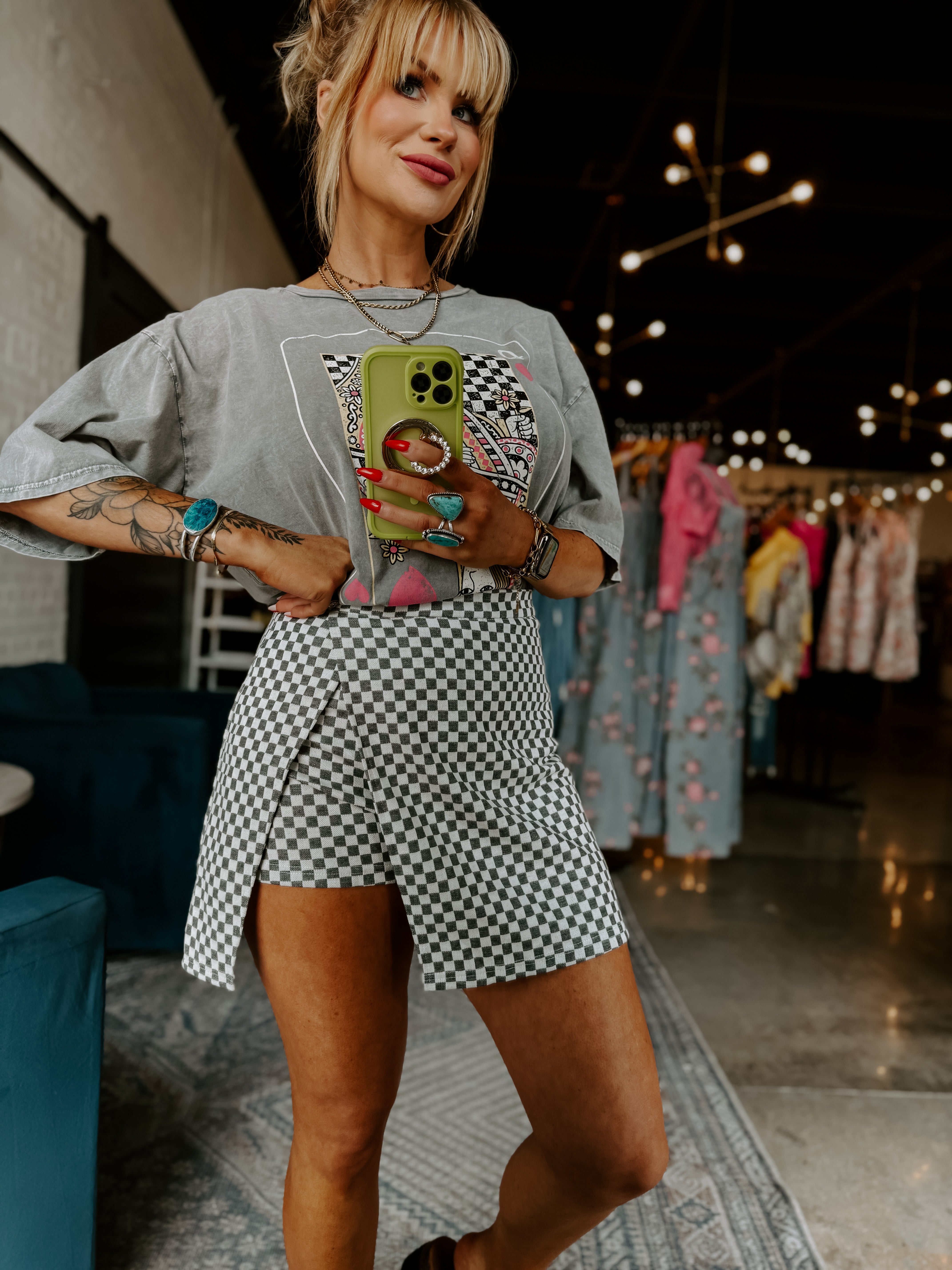 This checkerboard jacquard knit skort combines style and functionality with its bold pattern and tailored fit. Featuring a convenient back zipper closure for easy wear and integrated inner shorts, it offers both comfort and coverage. Perfect for those seeking a modern, sporty look with a polished finish. The back waist band does stretch!