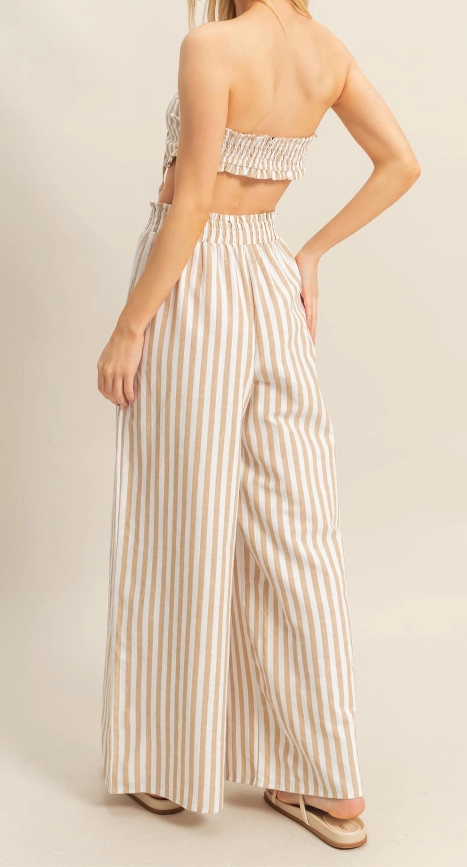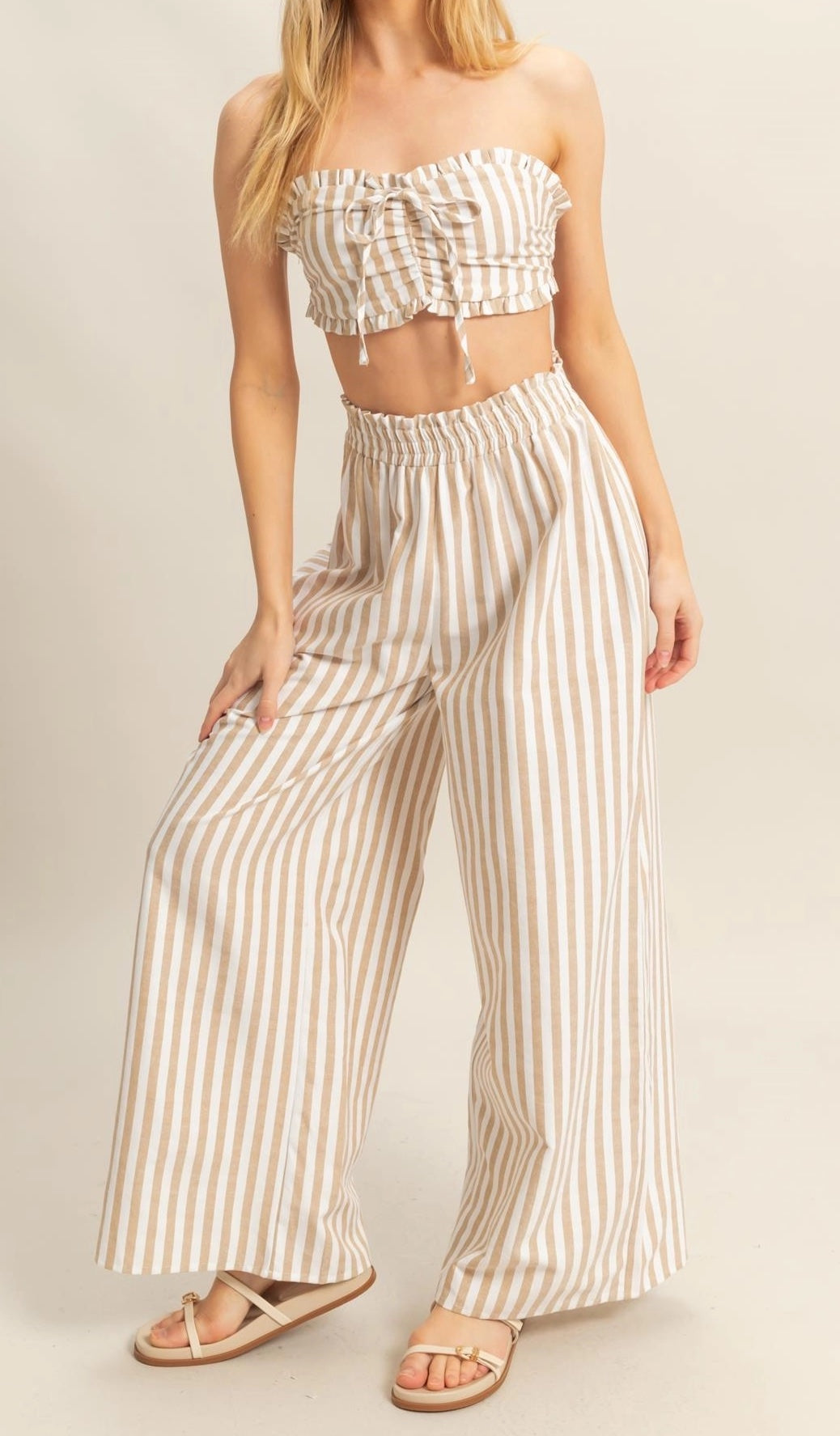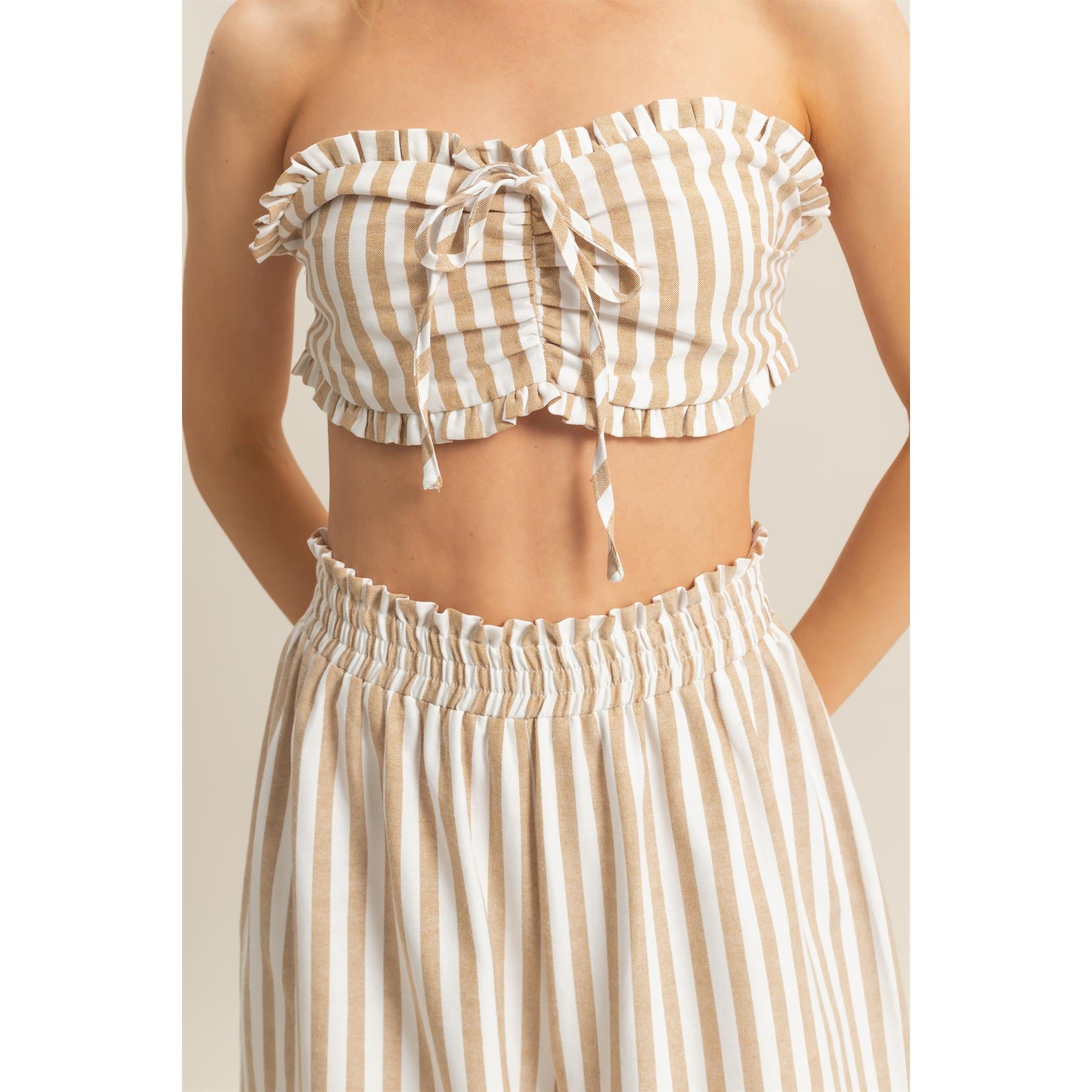 Elevate your poolside look with this fashionable fit. Featuring a fashionable strapless neckline and charming frill details, the top pairs perfectly with the comfortable high, elasticized waist and wide leg pants. The striking stripe pattern adds a fashionable touch to this essential outfit.