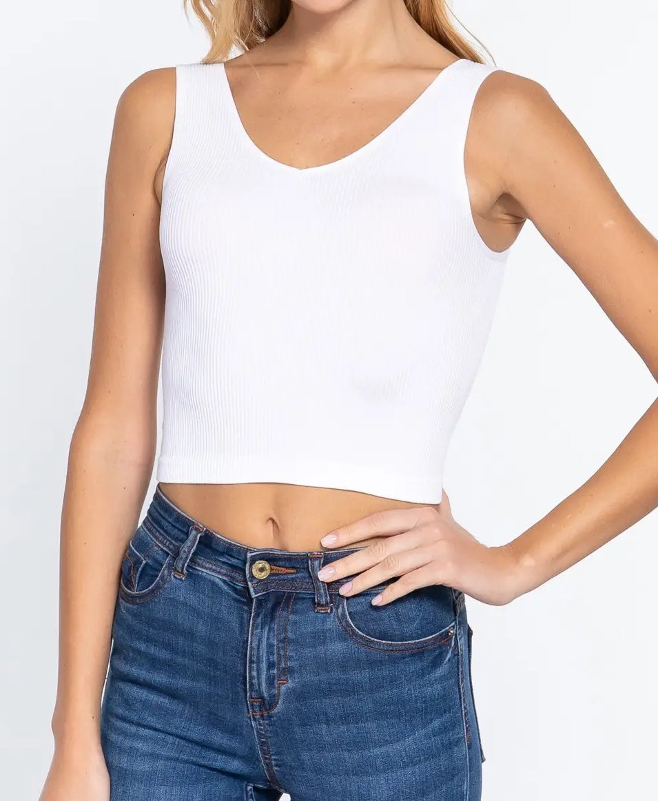 This reversible crop tank offers versatile styling with both V-neck and round neck options. Crafted from seamless rib fabric composed of 92% nylon and 8% spandex, it provides a comfortable, stretchy fit that moves with you. Ideal for layering or wearing alone, this tank combines functionality with a sleek, modern design. Key word reversible!