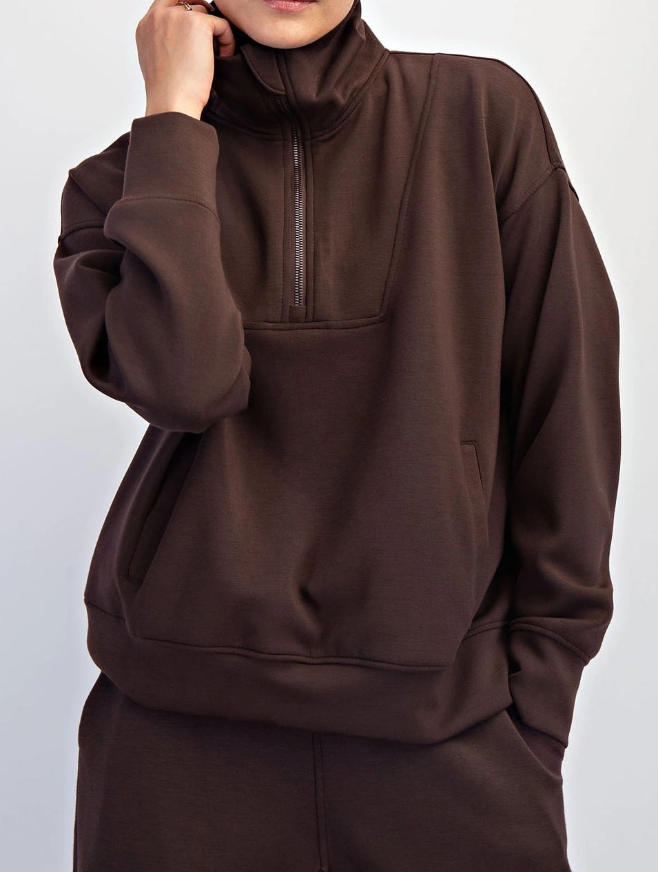 Experience unmatched comfort with this Modal Poly Span quarter zip pullover. Crafted from a butter-smooth, cooling fabric blend, it offers a soft touch and breathability ideal for all-day wear. The mock funnel neck and quarter zip provide versatile styling and temperature control, while the kangaroo pocket adds practicality. Designed with long sleeves, this pullover delivers both functional warmth and a streamlined fit for an expert-level layering piece.