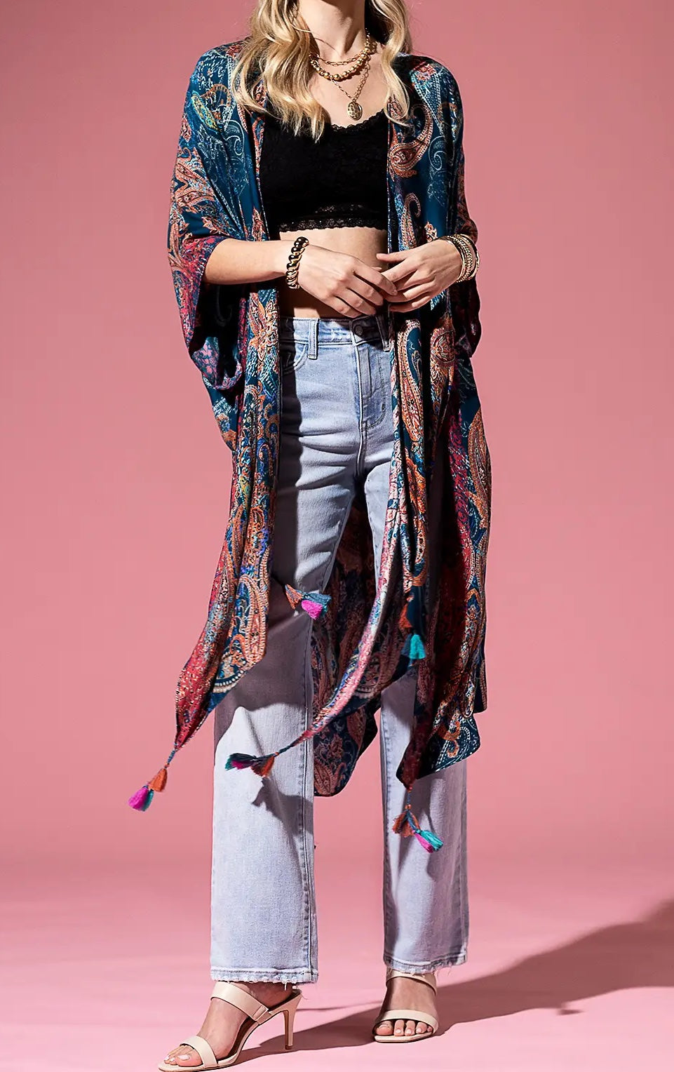 Elevate your wardrobe with the Sophie Kimono, featuring a sophisticated shadow effect print intertwined with classic paisley motifs. Expertly designed with carefully arranged patterns and delicate corner tassels, this piece offers a rare fusion of vintage charm and contemporary elegance. Its unique craftsmanship ensures a standout addition to any collection, embodying refined style and timeless beauty.