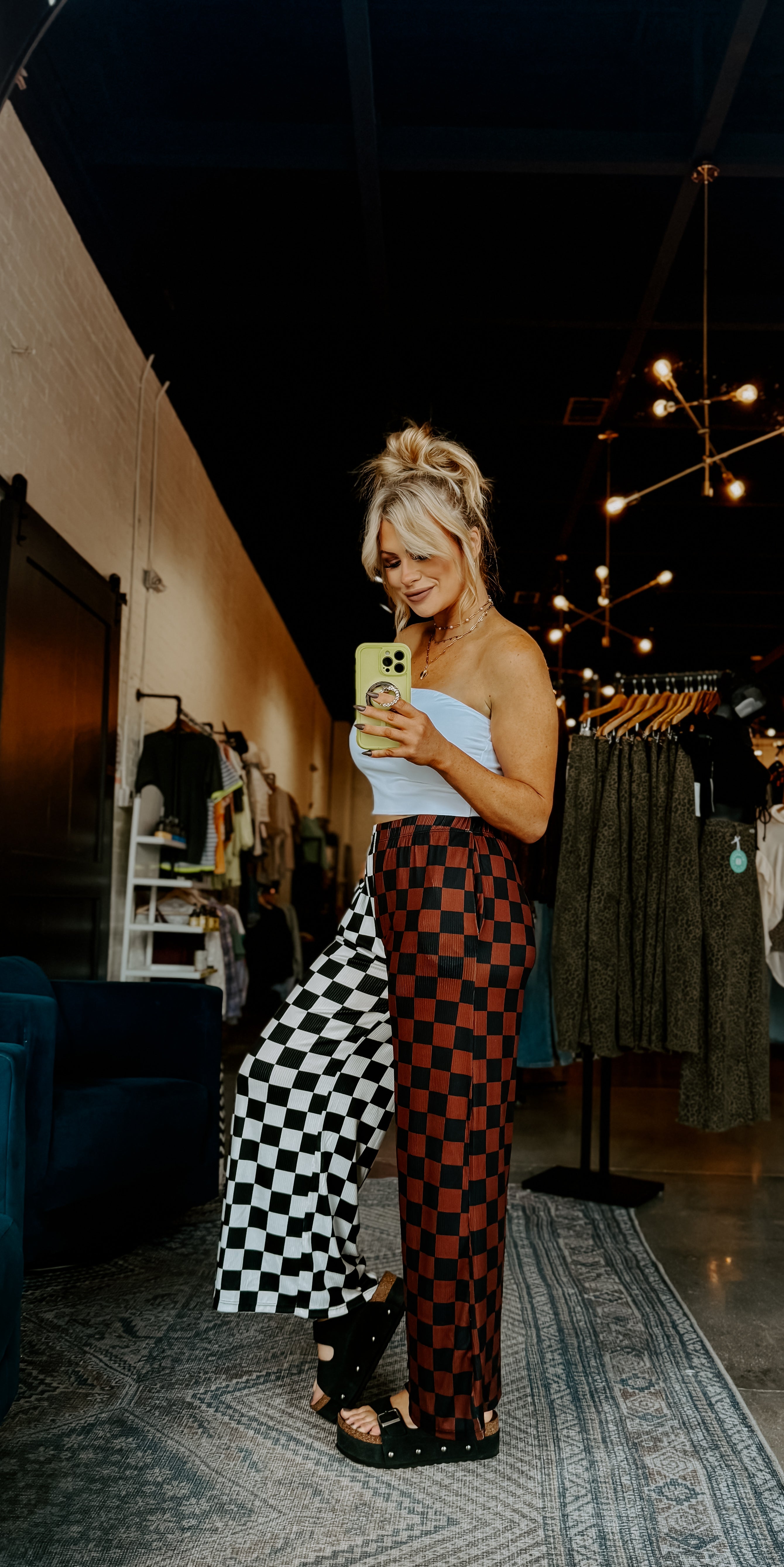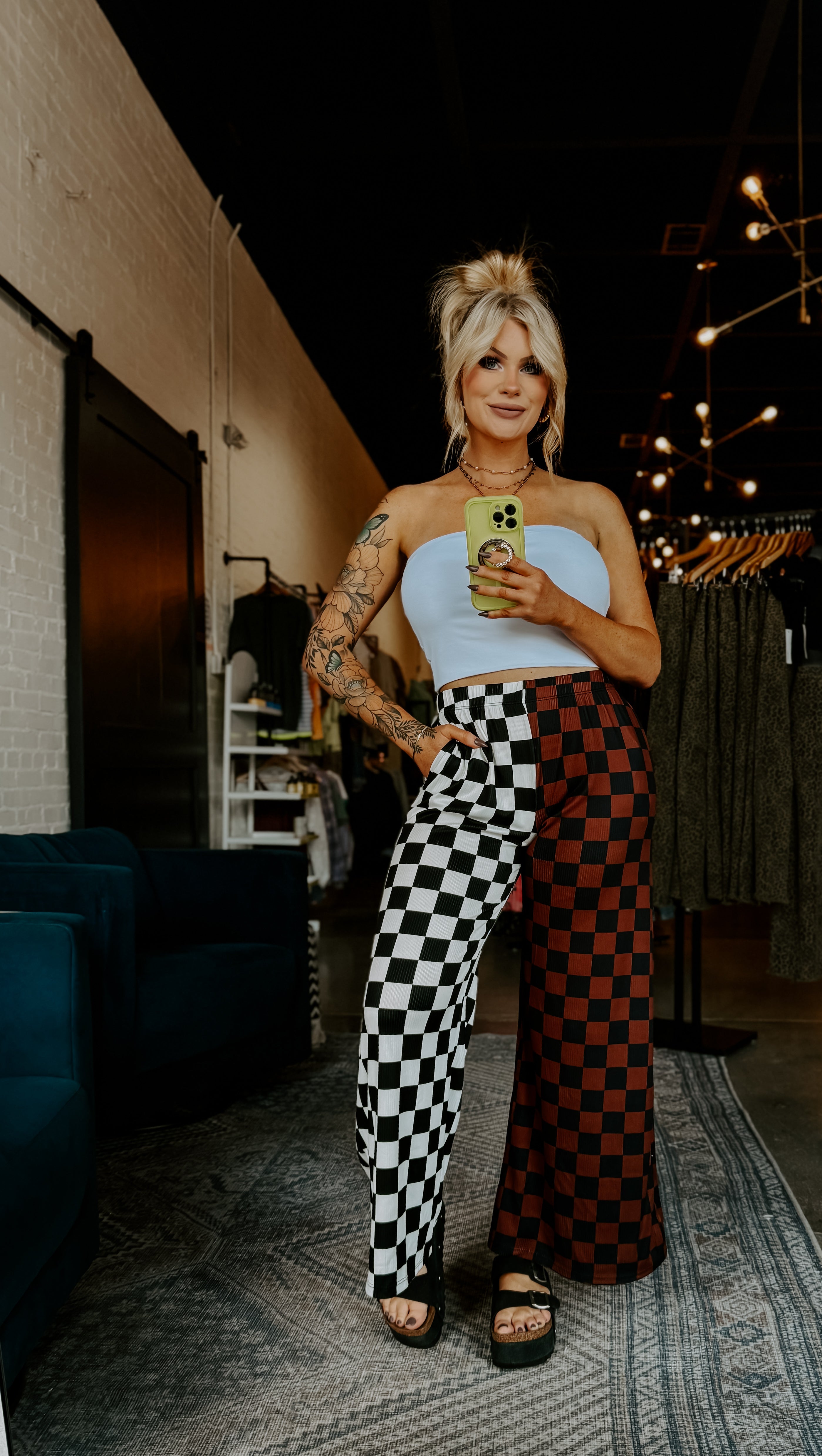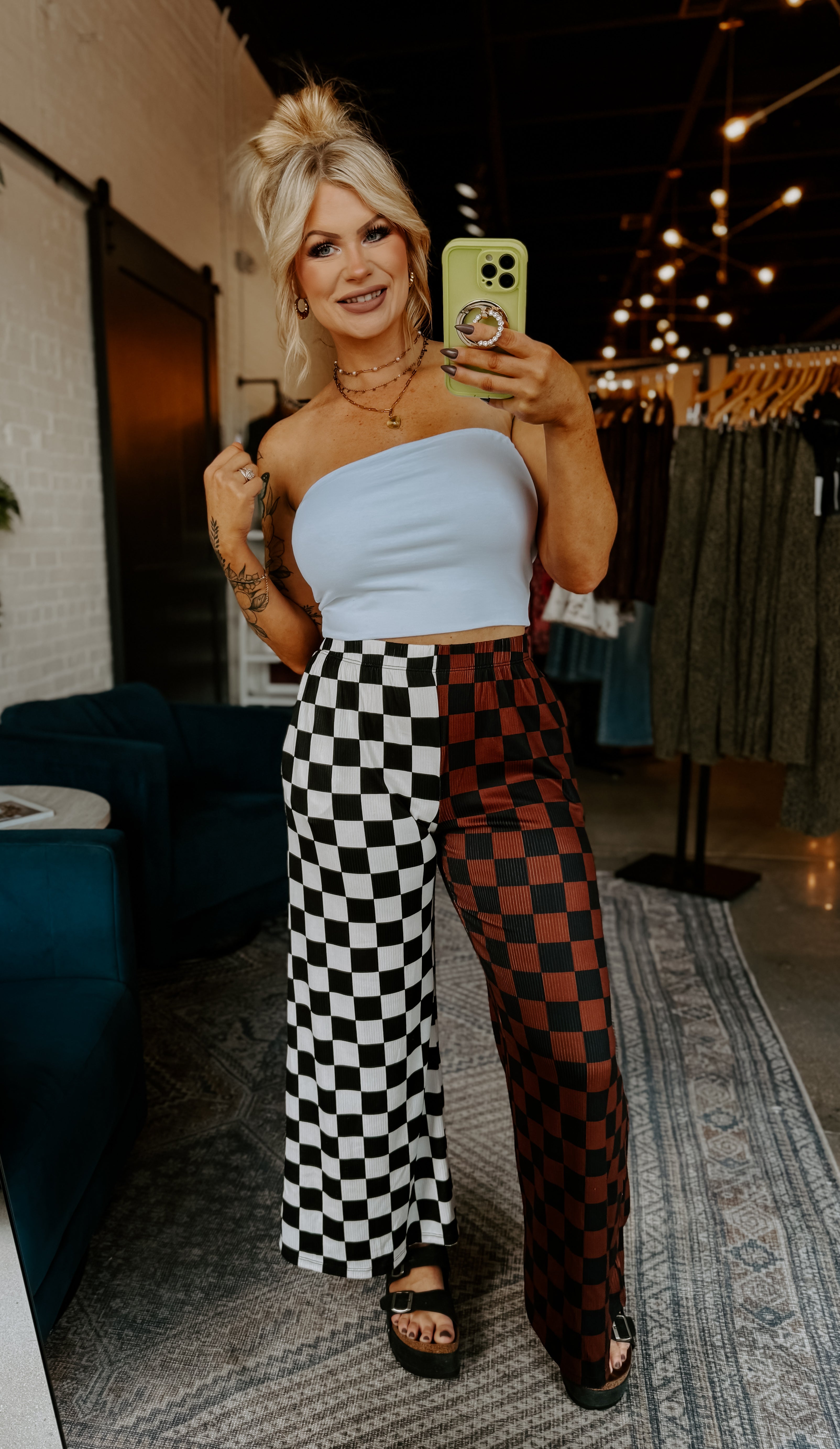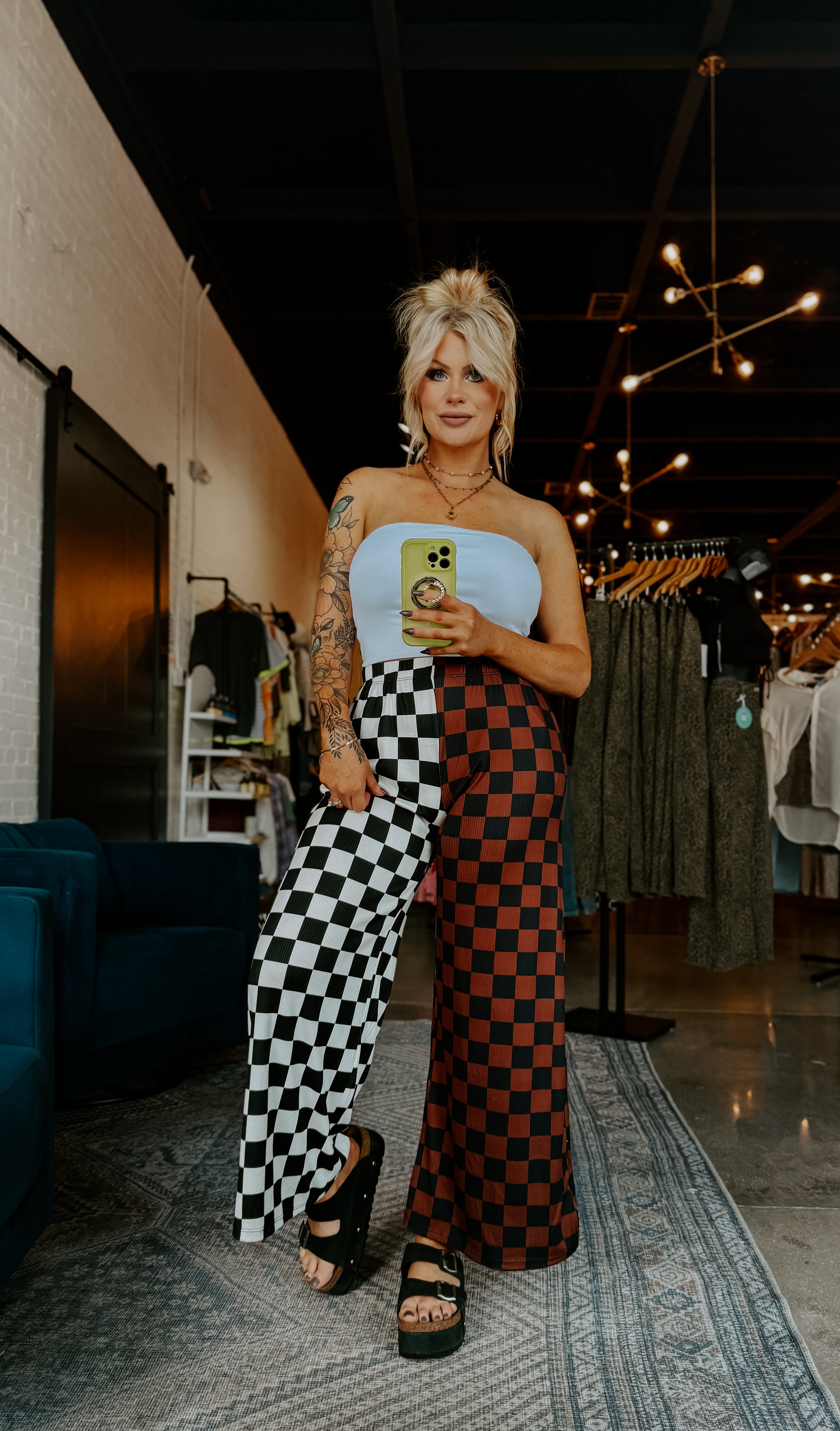 These Split Decision Checkered Pants bring playful vibes with their bold two-tone design and super stretchy, soft fabric that moves with you. Featuring an elastic waistband and handy pockets, they offer comfort and convenience all day long. The full-length wide leg adds a relaxed, fun silhouette perfect for any casual adventure.
