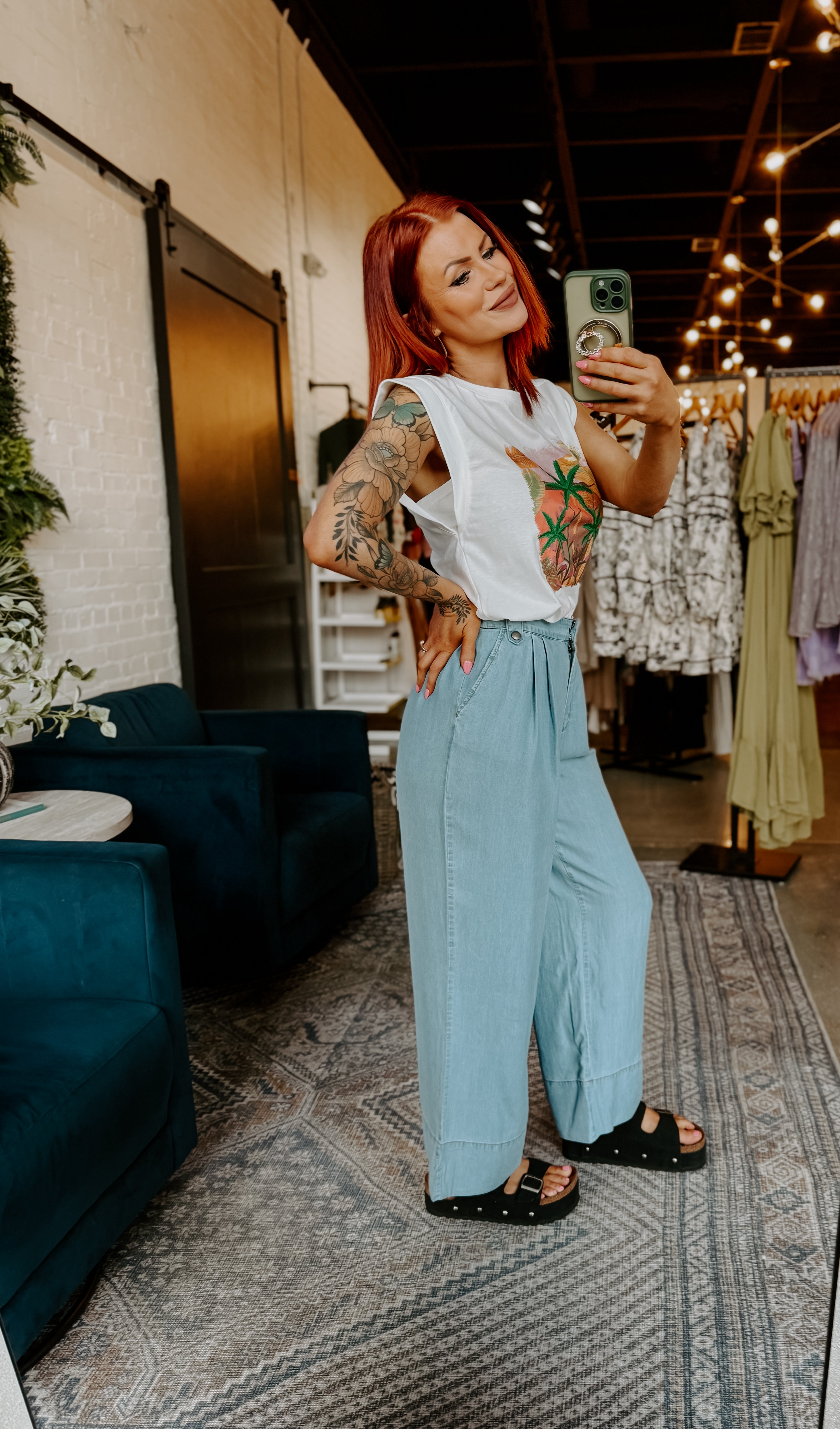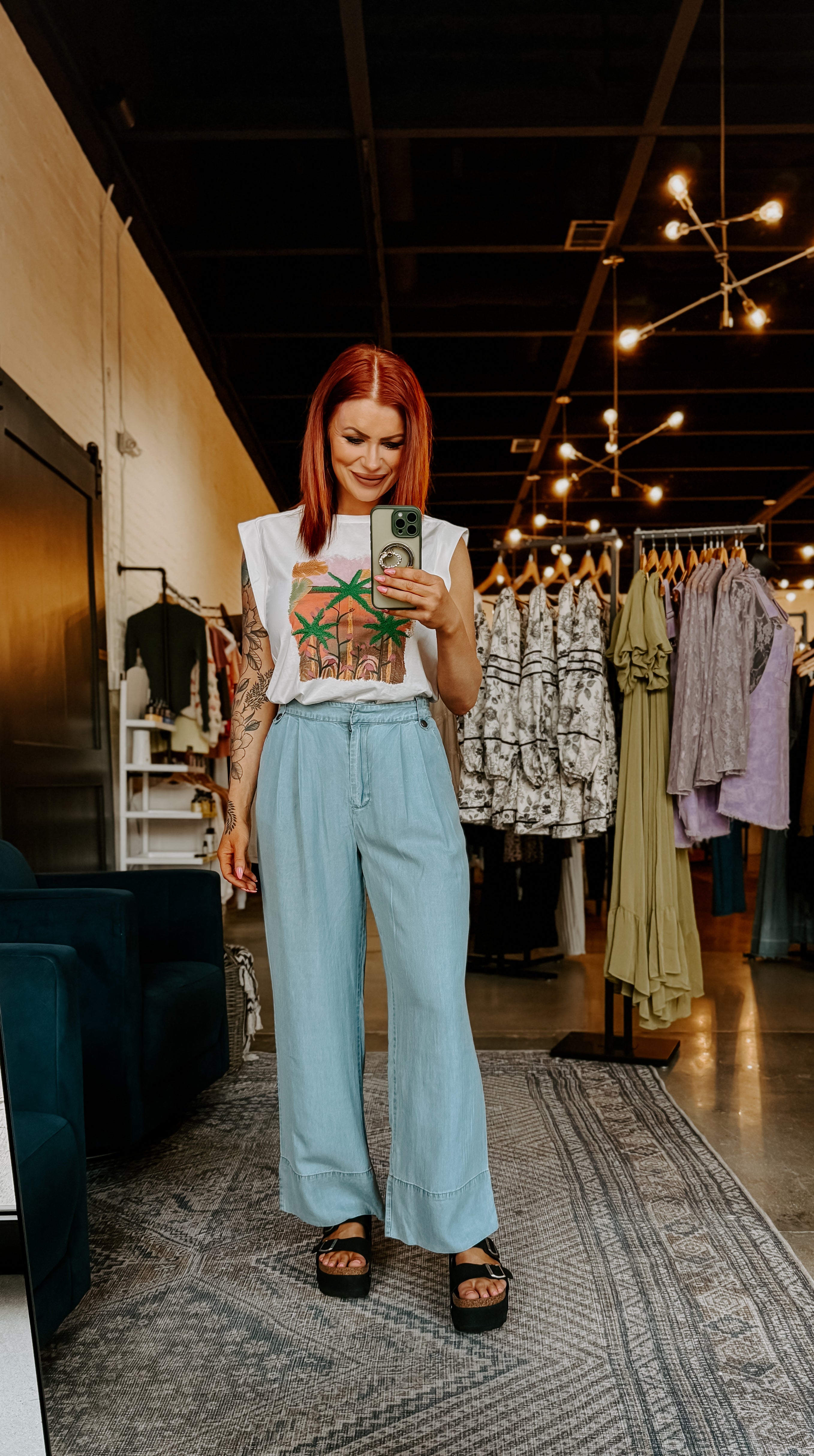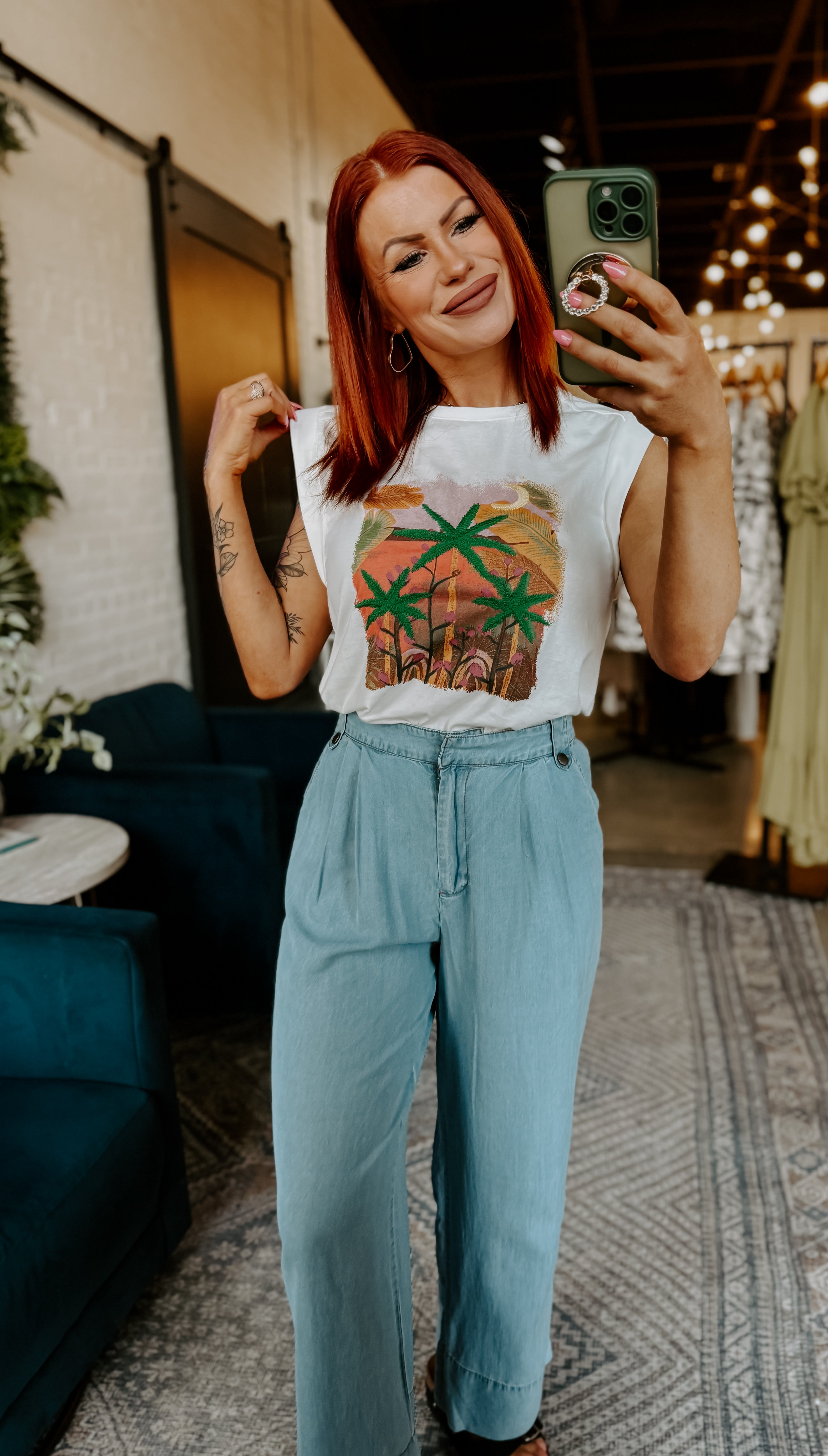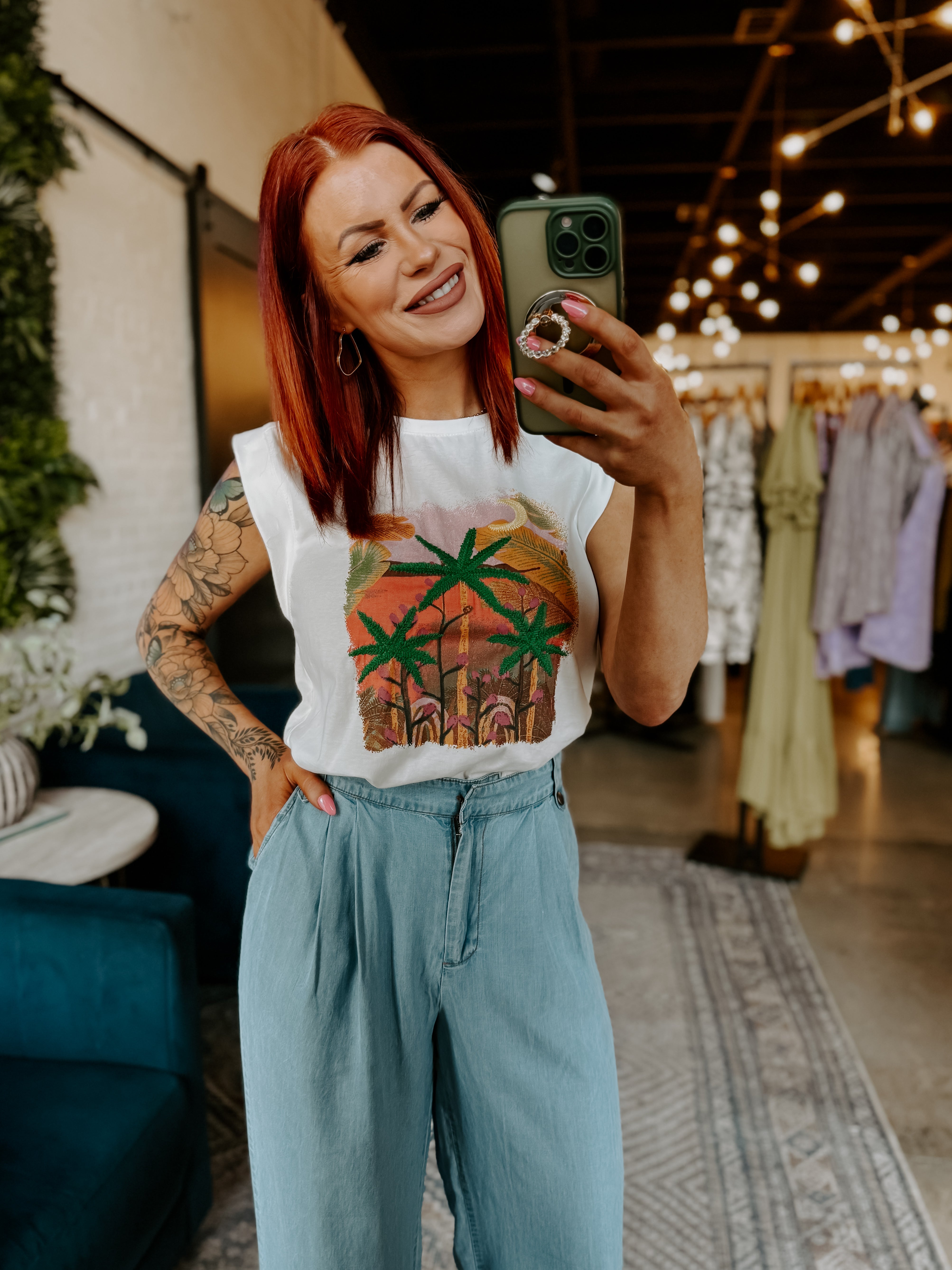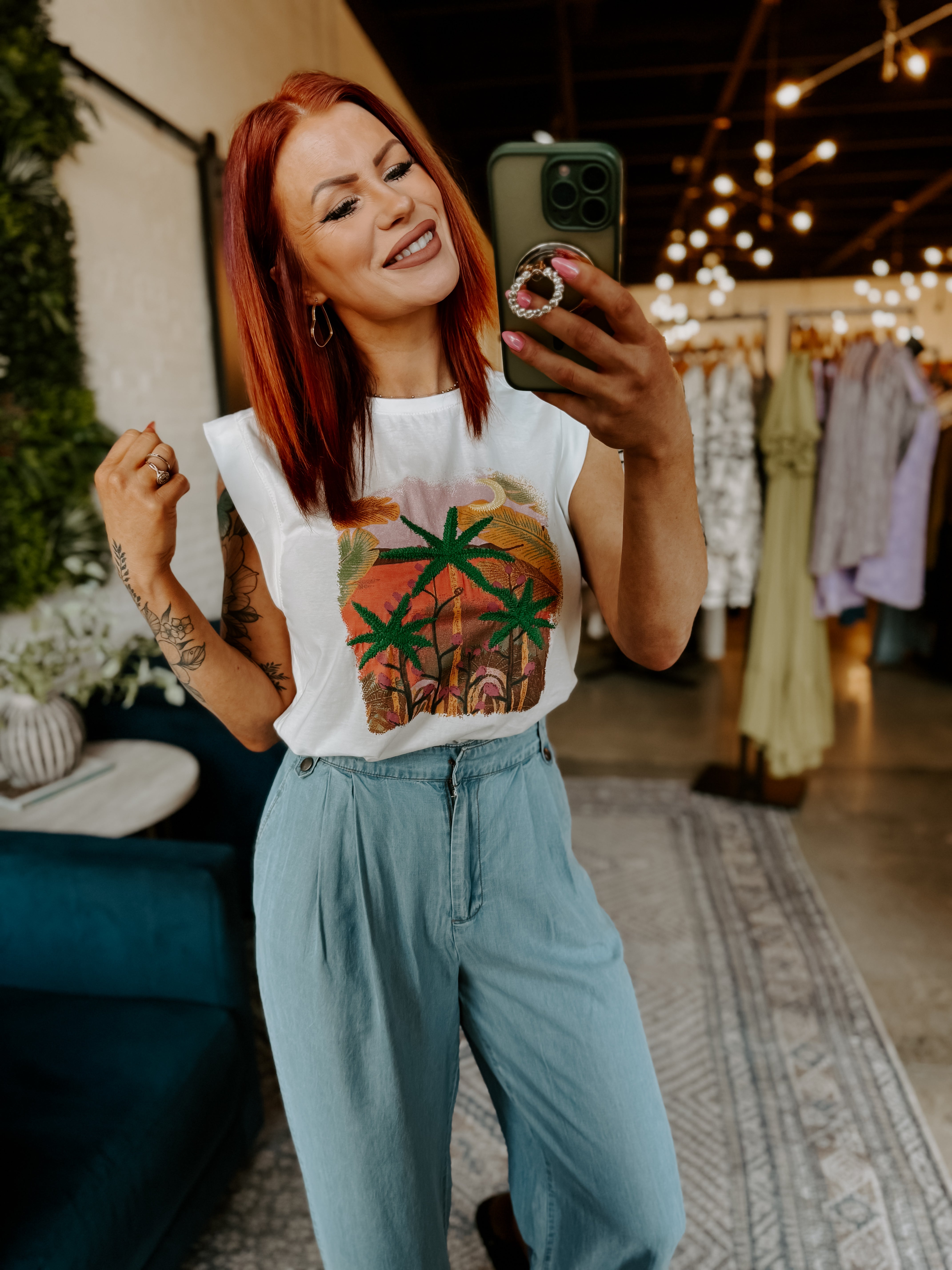 Indulge in luxury and sophistication with our Tropical Muscle Tee. Featuring a beautiful textured tropical design, this tee exudes elegance and exclusivity. Perfect for adding a touch of art and fashion to your wardrobe. This top also has the extra fabric that looks like you have an under shirt on ..under the pit area.