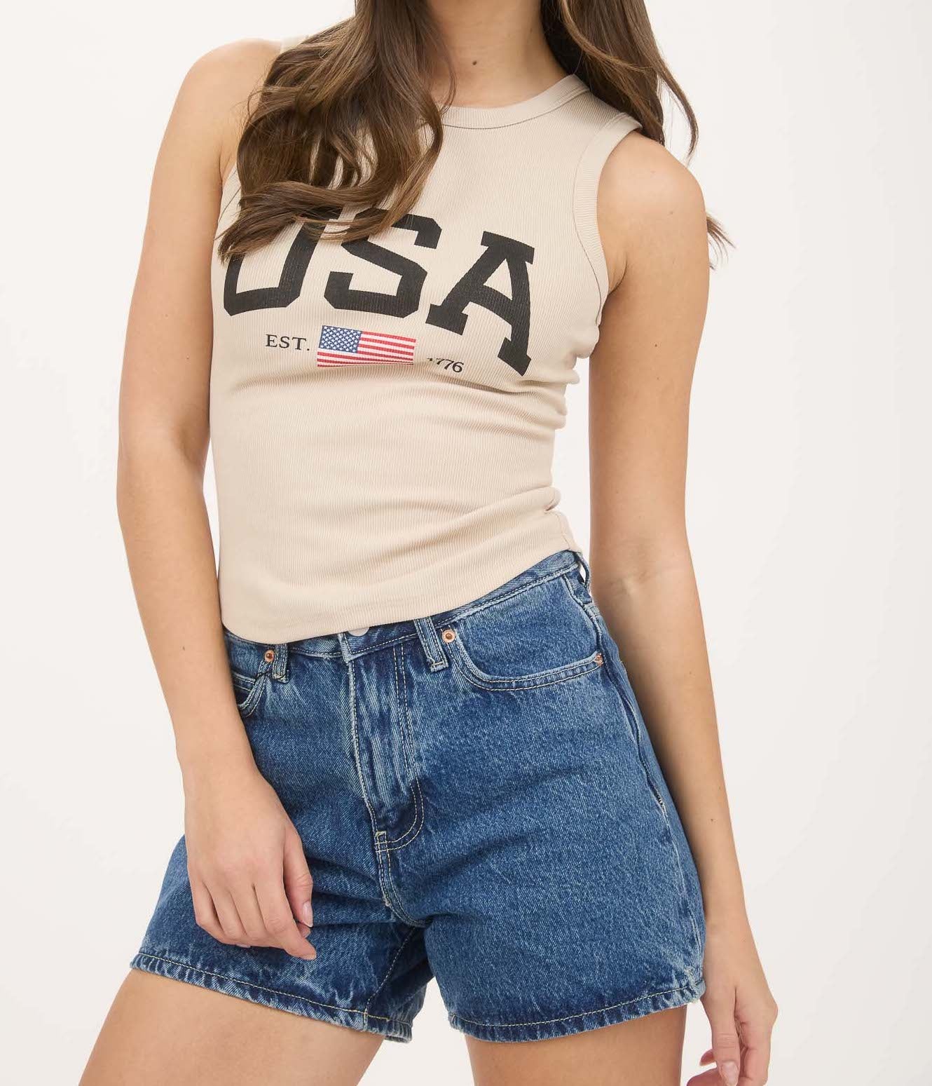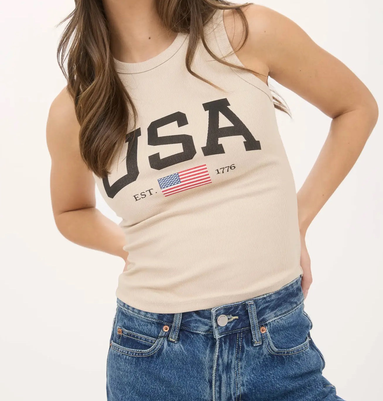 This fitted knit tank top features a classic round neckline and sleeveless design for comfortable wear. Crafted from a blend of 80% cotton, 15% polyester, and 5% spandex, it offers both softness and stretch. The bold American flag graphic adds a patriotic touch, making it a versatile piece for casual or festive occasions.