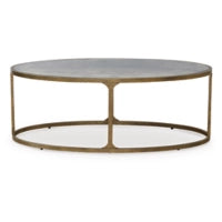 This coffee table expertly combines traditional charm with modern elements. Its tubular steel frame features a durable powder-coated finish in an antiqued goldtone texture, evoking handcrafted metalwork. The inset tempered glass top, adorned with a faux marble finish, adds a sophisticated touch that complements various decor styles. Ideal for displaying decorative accents or organizing entertainment essentials, this piece enhances your living space with refined transitional elegance.