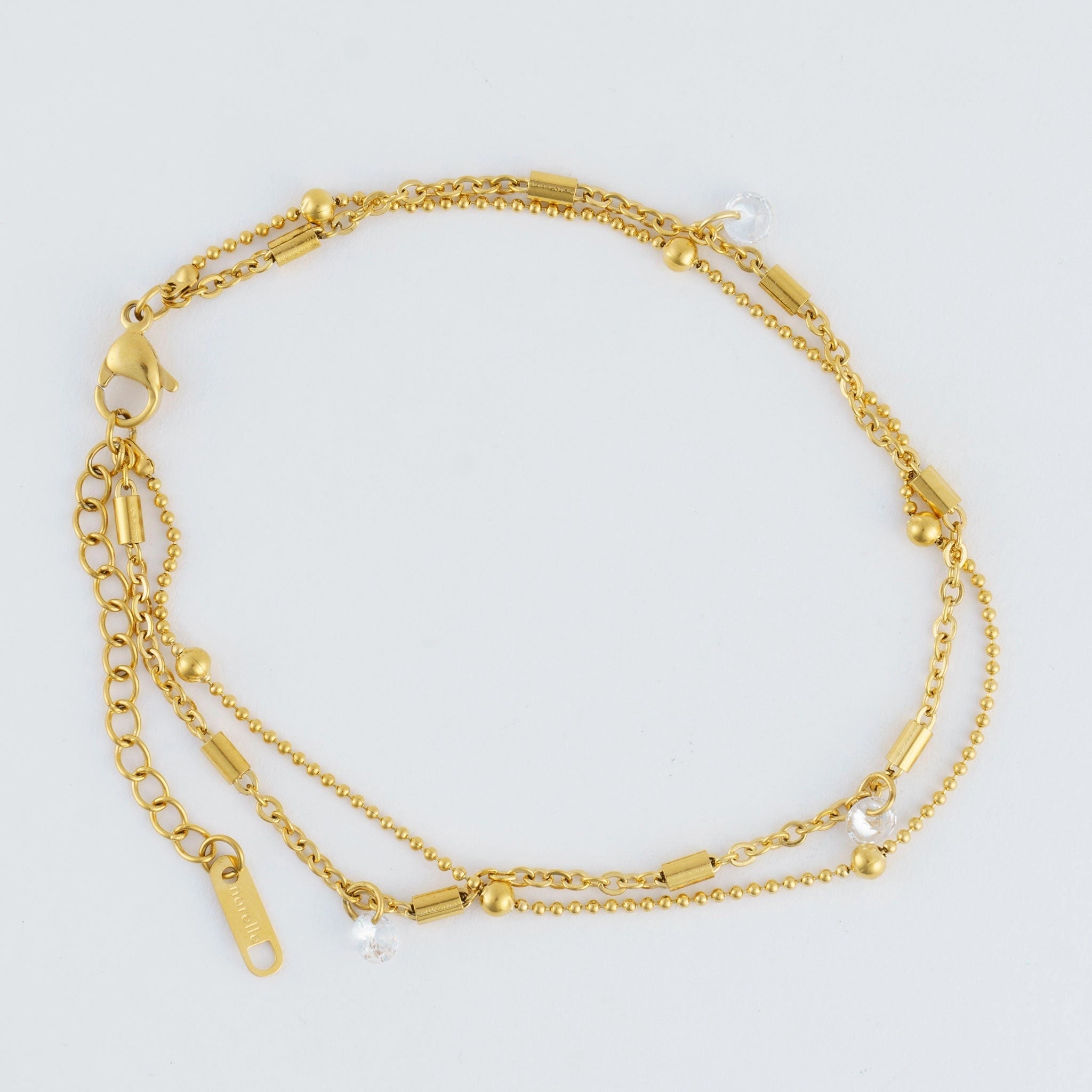 A modern take on a classic, the Narelle Waterproof Dainty Multi Row Anklet offers two delicate, mismatched chains in a chic gold with subtle sparkly detailing. Designed to help you achieve a curated stacked look, this minimalist anklet is the perfect finishing touch to any summer outfit. Waterproof, 18K gold plated and made with a specialized PVD technique to withstand the rigors of life, from swimming and showering to sweating through your most intense workouts, all without ever losing its shine. waterproof jewelry, gold jewelry, stainless steel jewelry, fade proof, tarnish resistant, water resistant, Real Gold Dipped, tarnish-free, non-tarnish, water proof, sweatproof jewelry, Fade Resistant, Anti-oxidation.