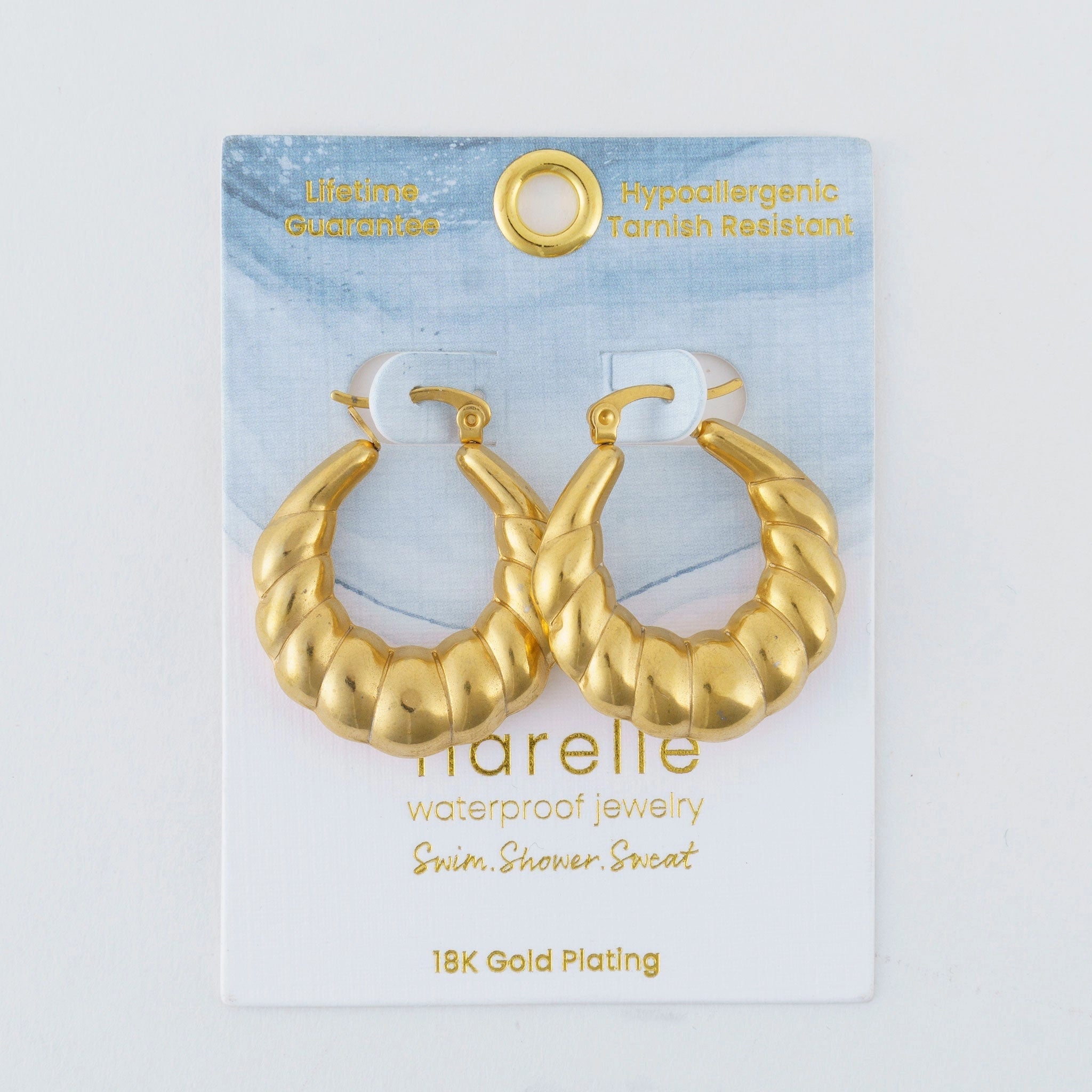 Chic and understated, the Narelle Waterproof Twisted Chunky Hoop Earrings offer a trendy twisted, chunky hoop design in classic, goes-with-everything gold or silver. With a familiar pin catch closure and effortless style, these earrings are an instant wardrobe staple. Waterproof , 18K gold or Stainless Steel plated and made with a specialized PVD technique to withstand the rigors of life, from swimming and showering to sweating through your most intense workouts, all without ever losing its shine. waterproof jewelry, gold jewelry, stainless steel jewelry, fade proof, tarnish resistant, water resistant, Real Gold Dipped, tarnish-free, non-tarnish, water proof, sweatproof jewelry, Fade Resistant, Anti-oxidation.
