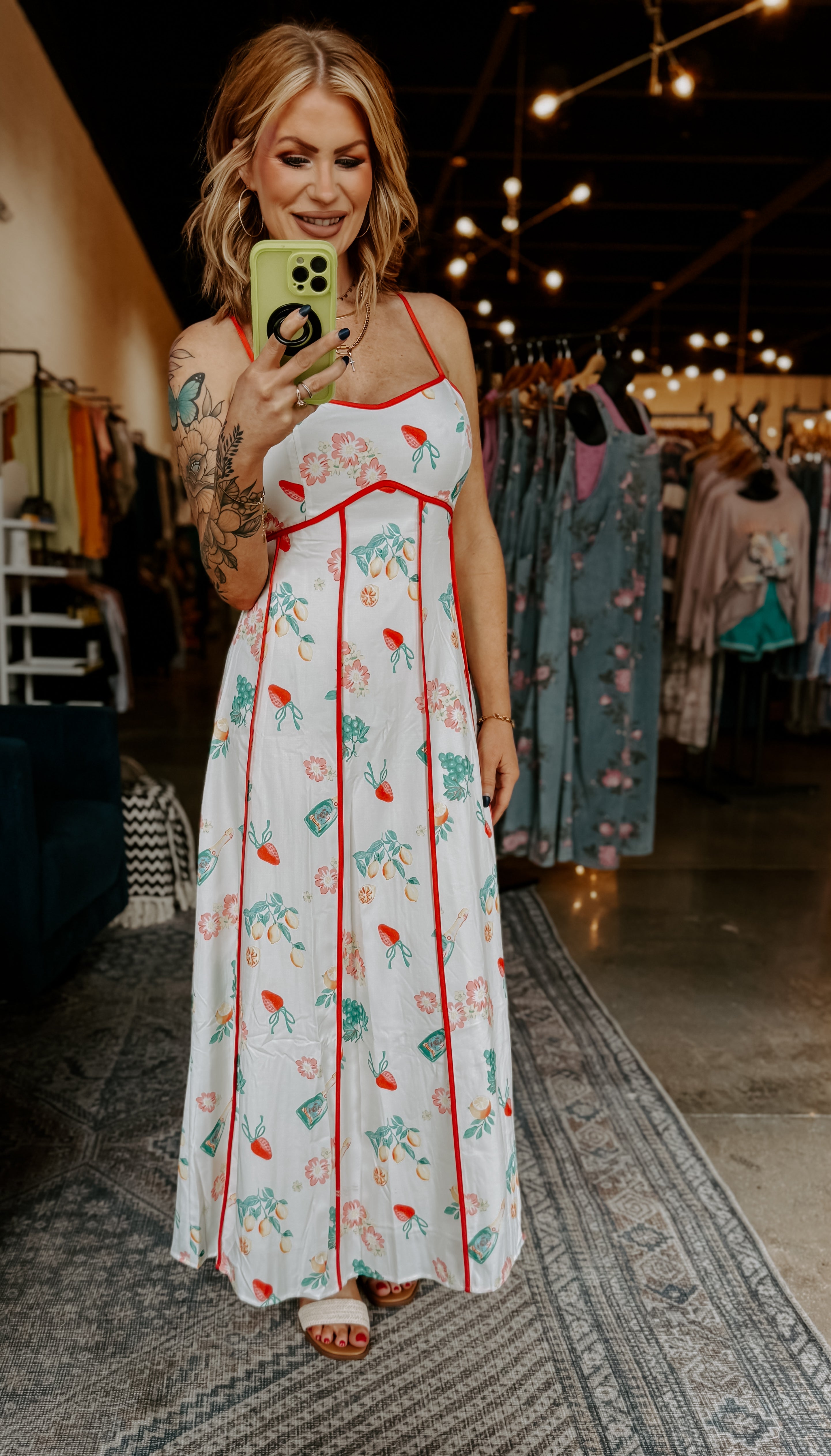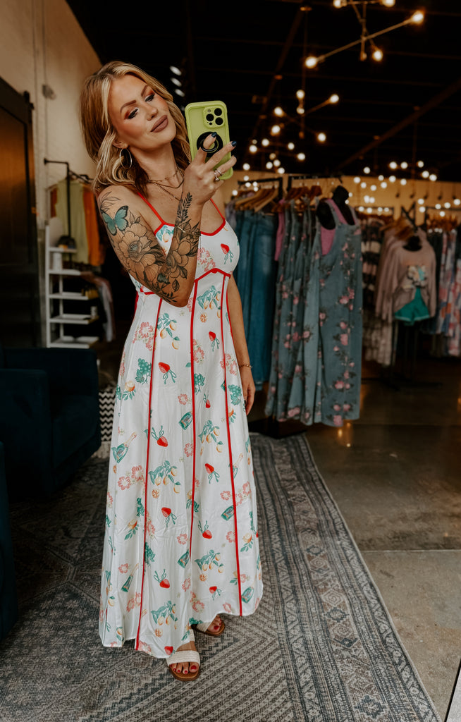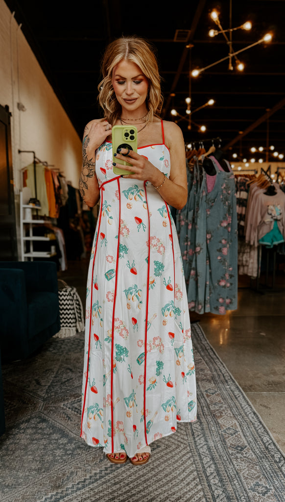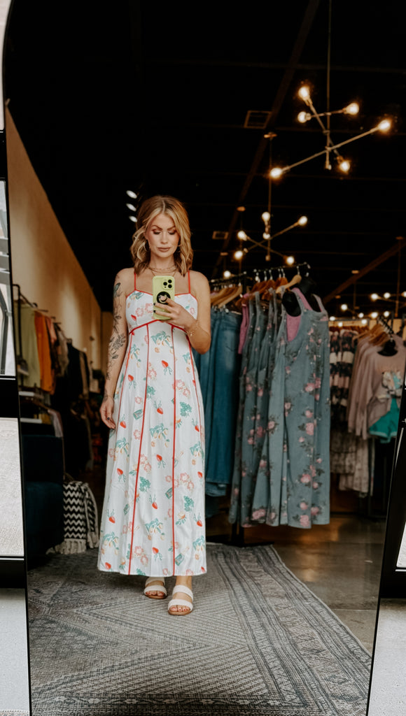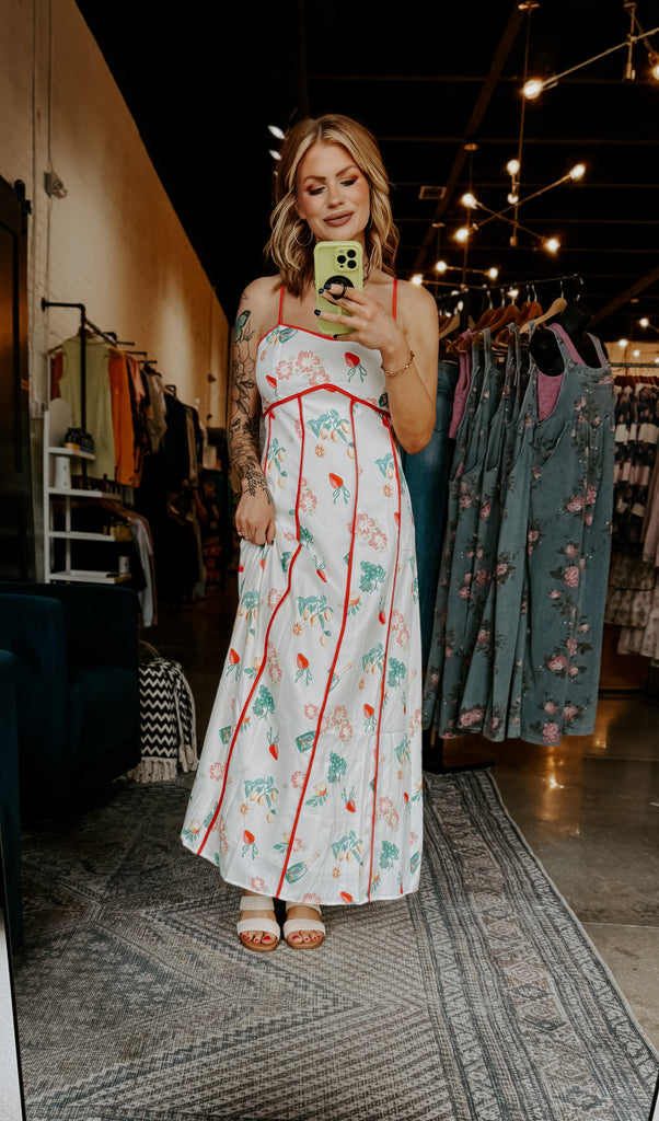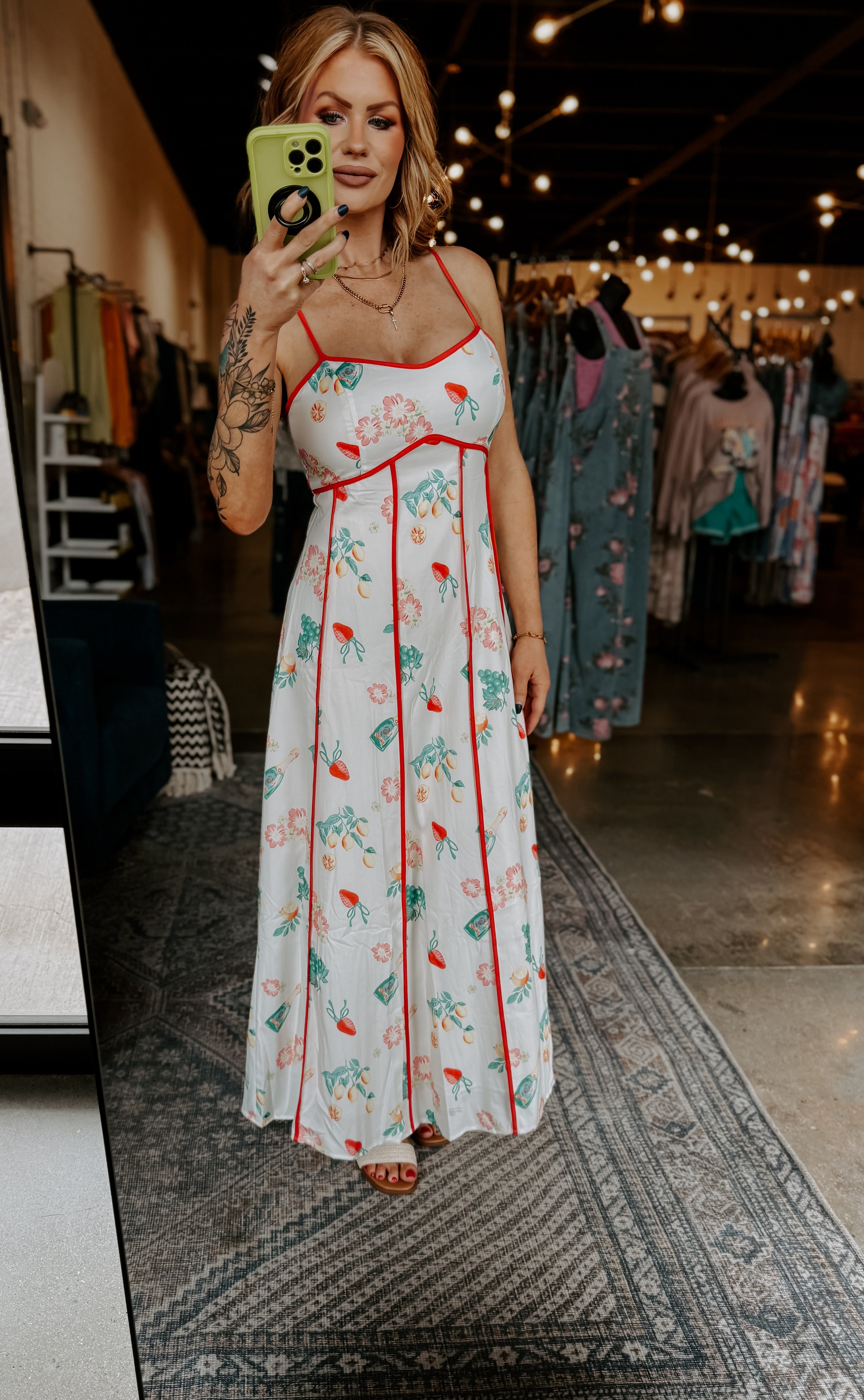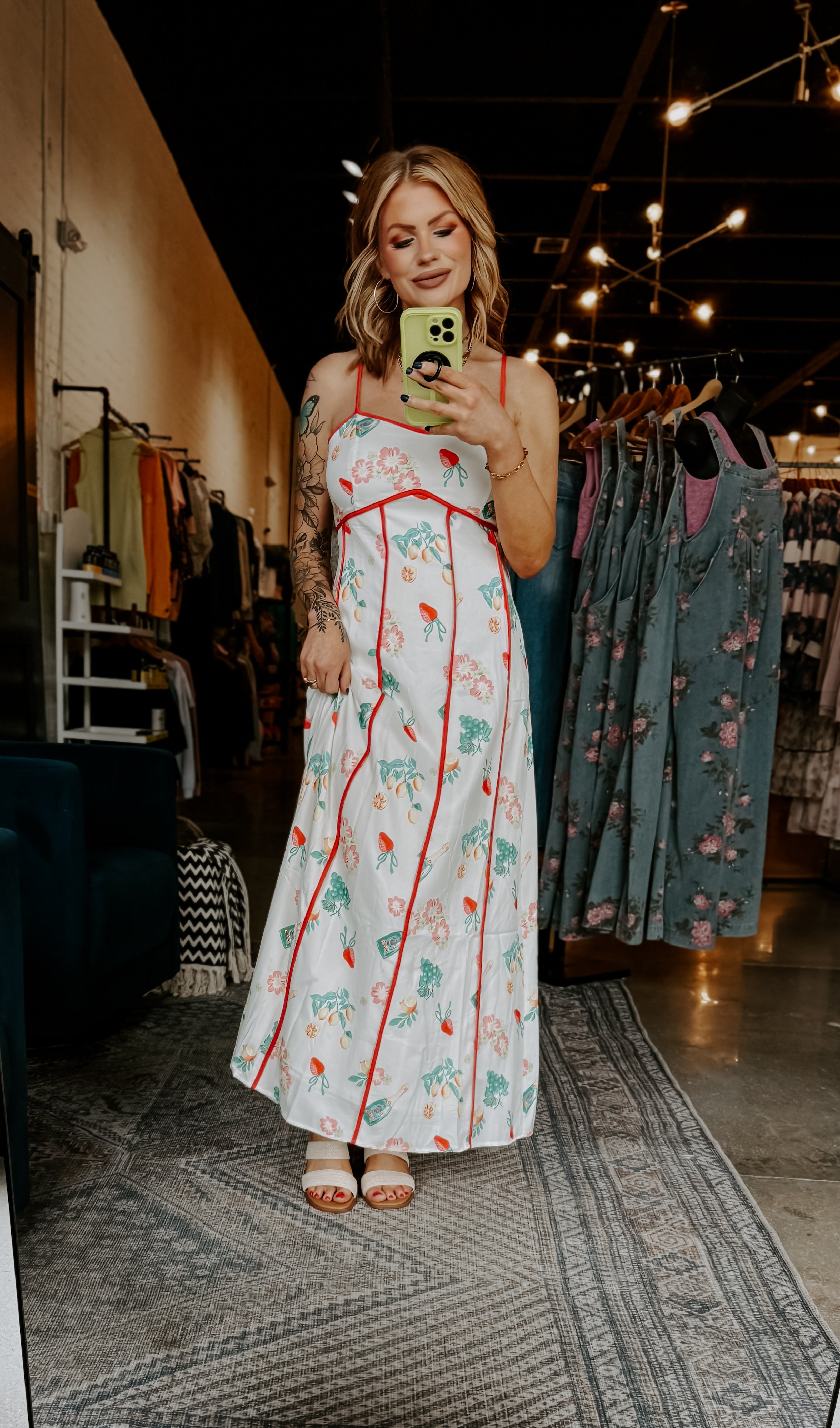 Get ready to make a statement with our Maxi Strap Dress! Featuring a unique vintage print and eye-catching contrast binding detail, this dress is sure to turn heads. With its maxi length, it's perfect for any occasion. Stand out in style and comfort.