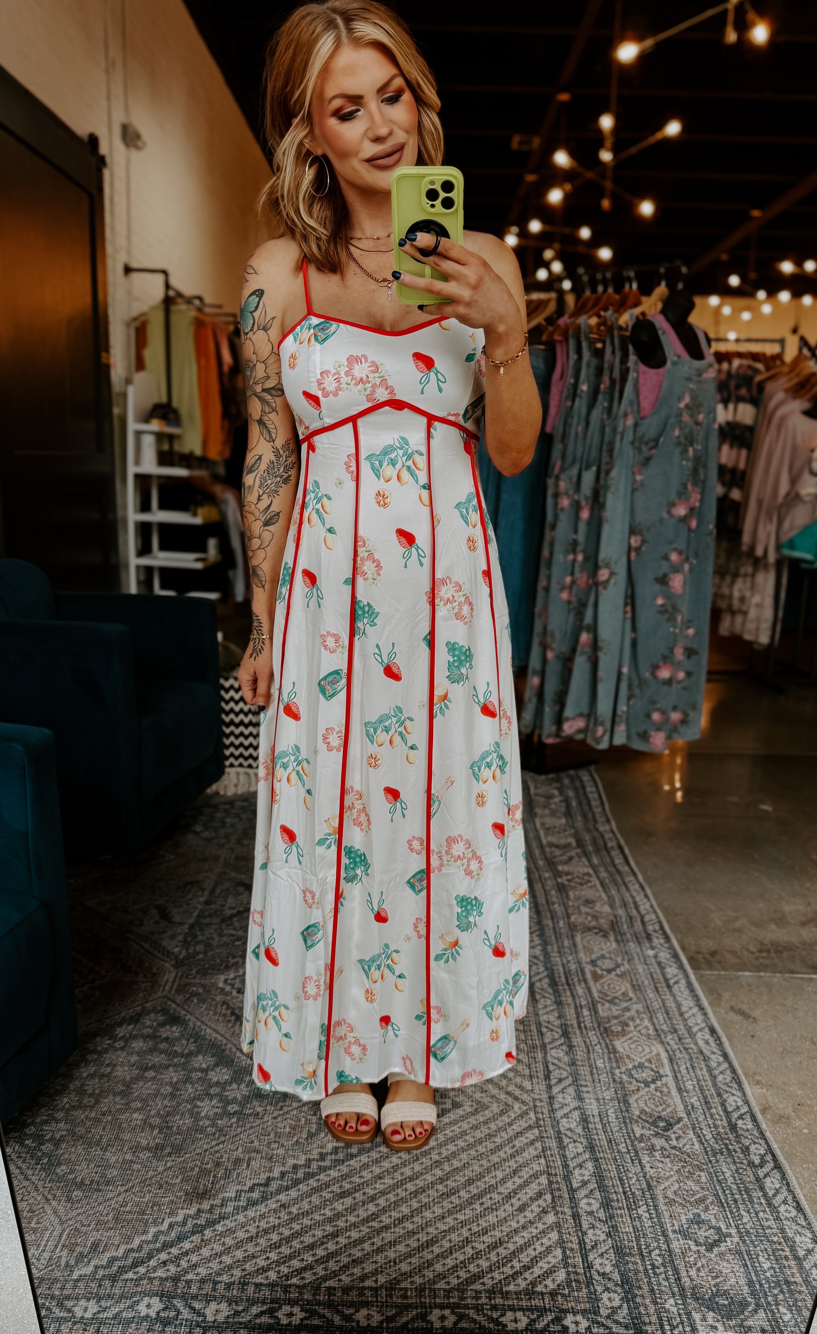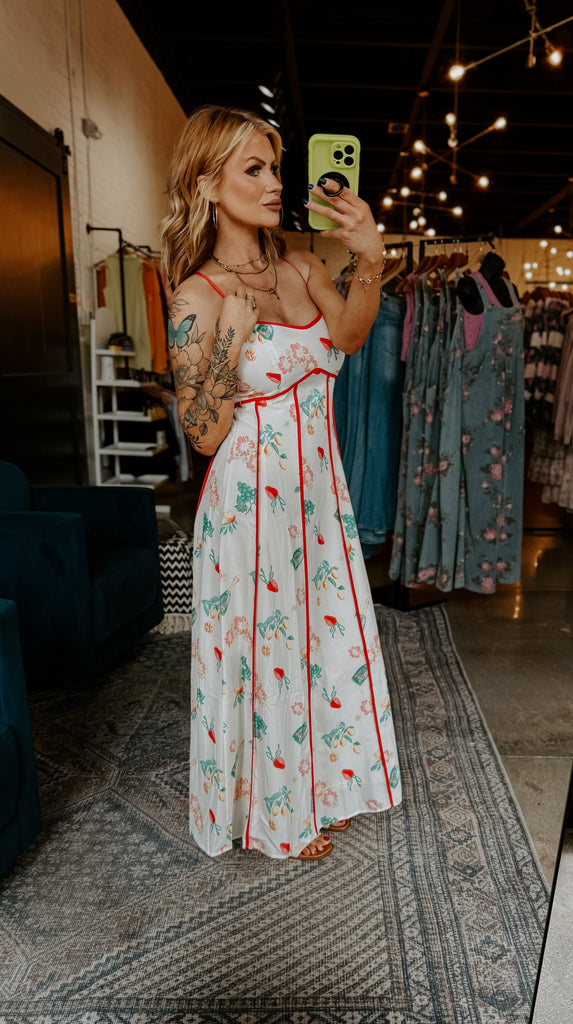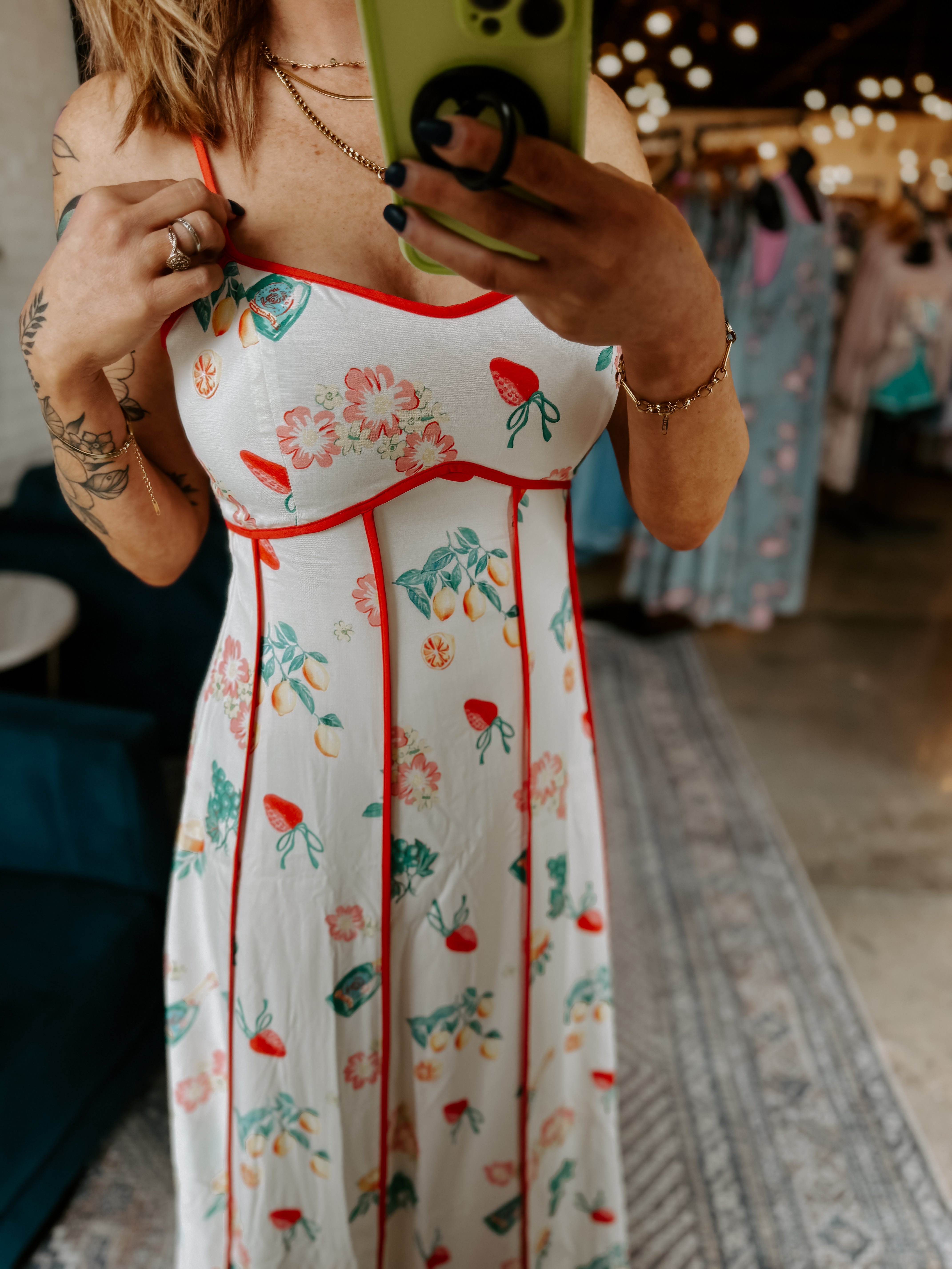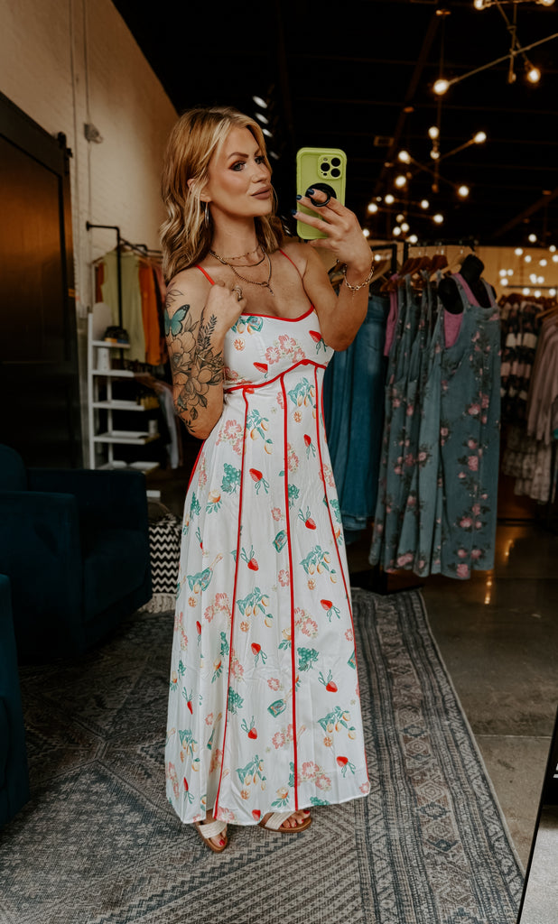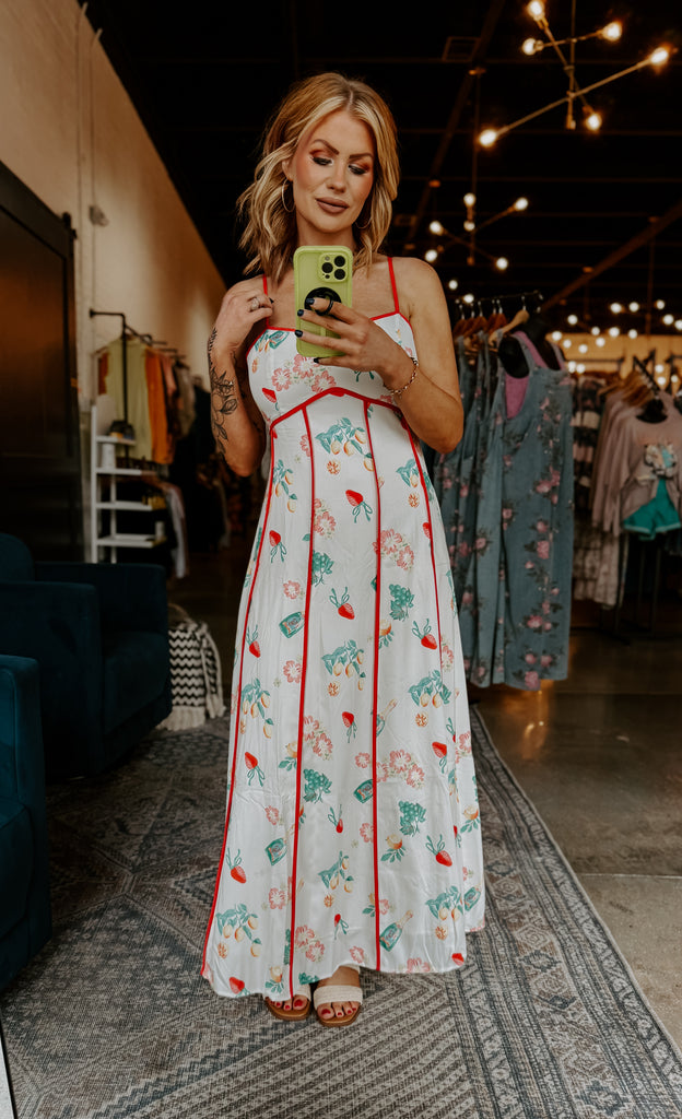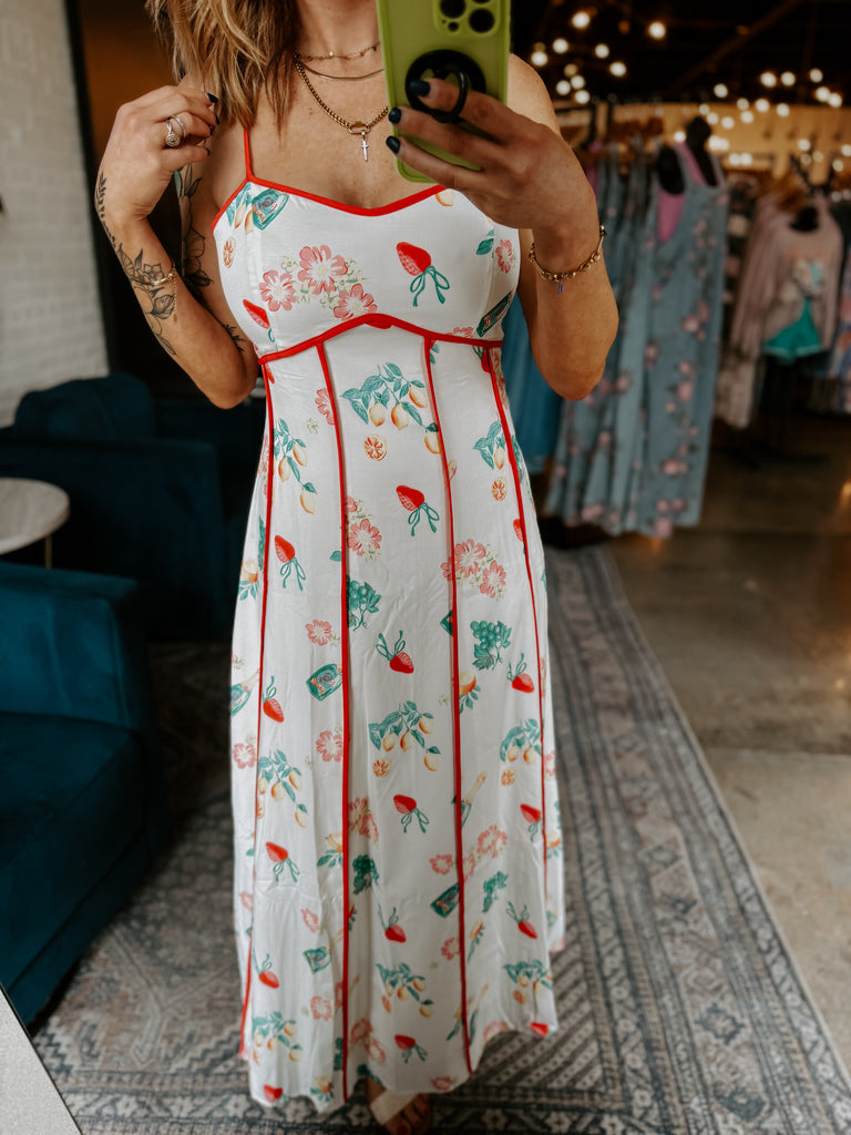 Get ready to make a statement with our Maxi Strap Dress! Featuring a unique vintage print and eye-catching contrast binding detail, this dress is sure to turn heads. With its maxi length, it's perfect for any occasion. Stand out in style and comfort.