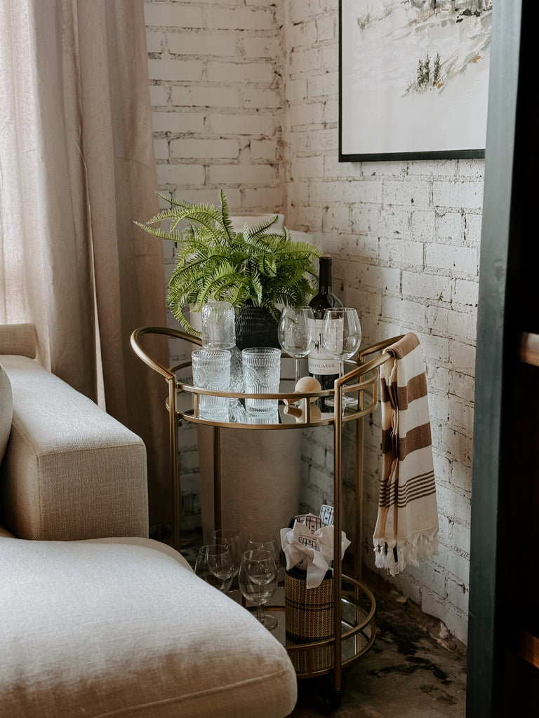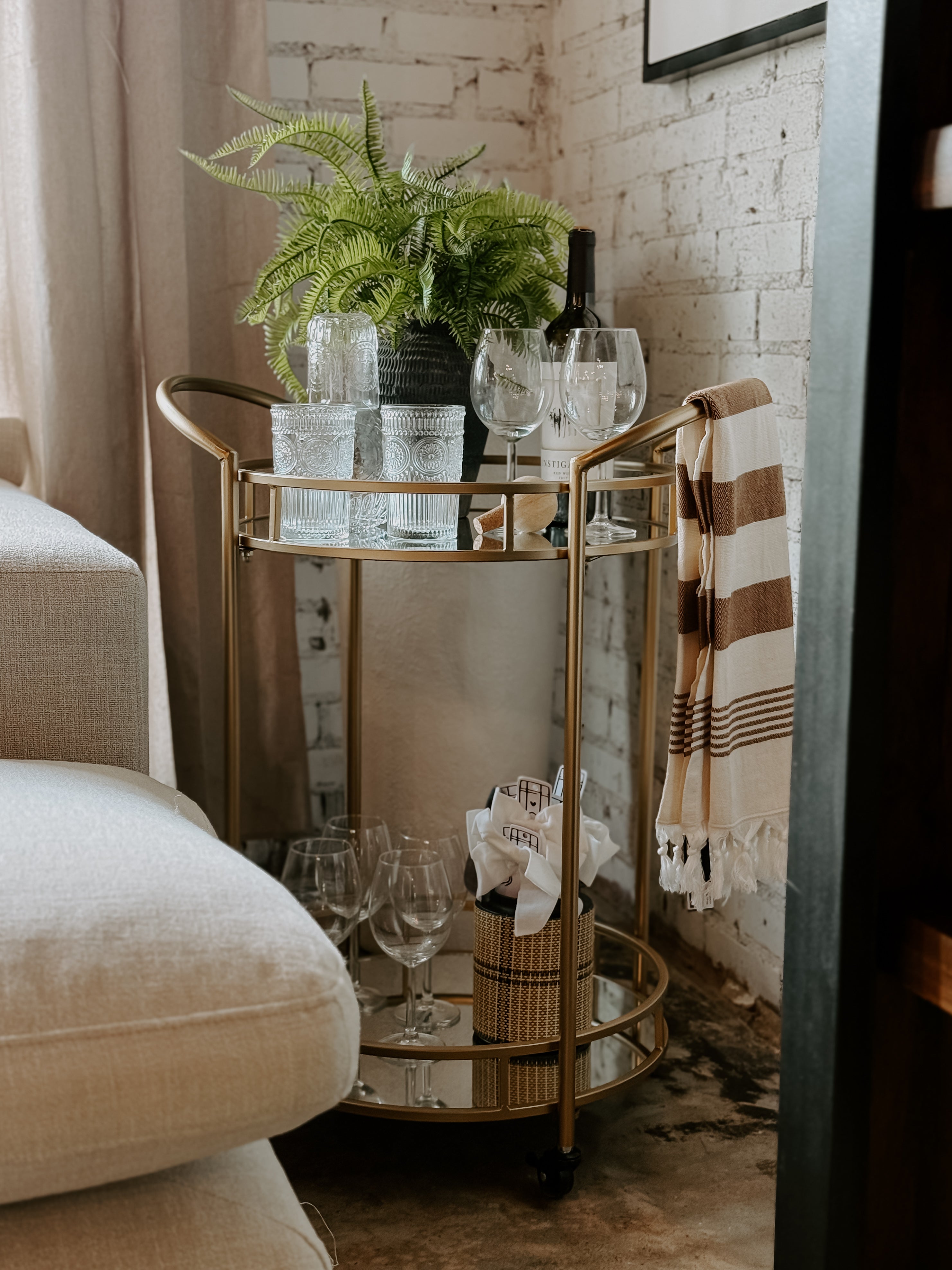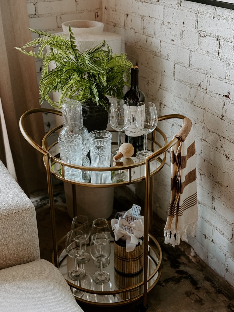 Add a bright spot to your contemporary space with this bar cart. Its beautifully bold blend of goldtone metal and mirrored glass heightens your home's modern aesthetic. It’s a striking choice for your kitchen or entryway, with locking casters allowing you to serve in style whenever and wherever it's needed.