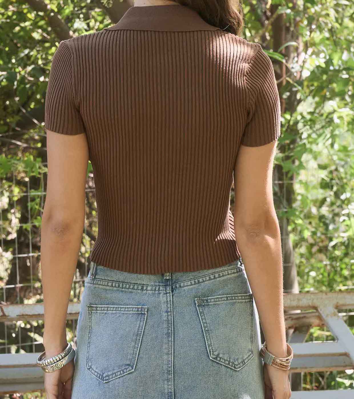 This expert-crafted cropped knit top features a collared neckline and short sleeves for a polished yet casual look. Made from a soft sweater knit blend of 70% viscose and 30% polyester, it offers comfortable stretch and durability. The front metal zipper adds a modern touch and easy wearability. Its solid color and unlined design make it a versatile layering piece suitable for various styles and seasons.